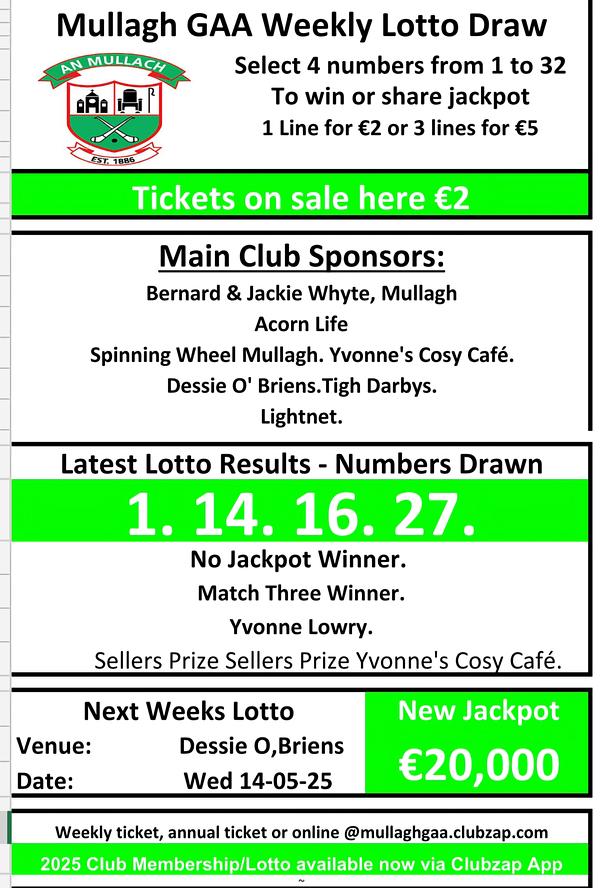 Mullagh GAA Lotto Result