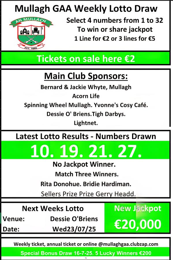 Congratulations to the match three winners and thank you everyone for supporting the Club Lotto.