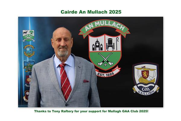 Hi all as most of you are probably aware, Mullagh GAA Club doesn't have a main sponsor, this decision was taken by the club's committee as there are so many people who help out the club by donating 250euro or more. These people become CAIRDE AN MULLACH.