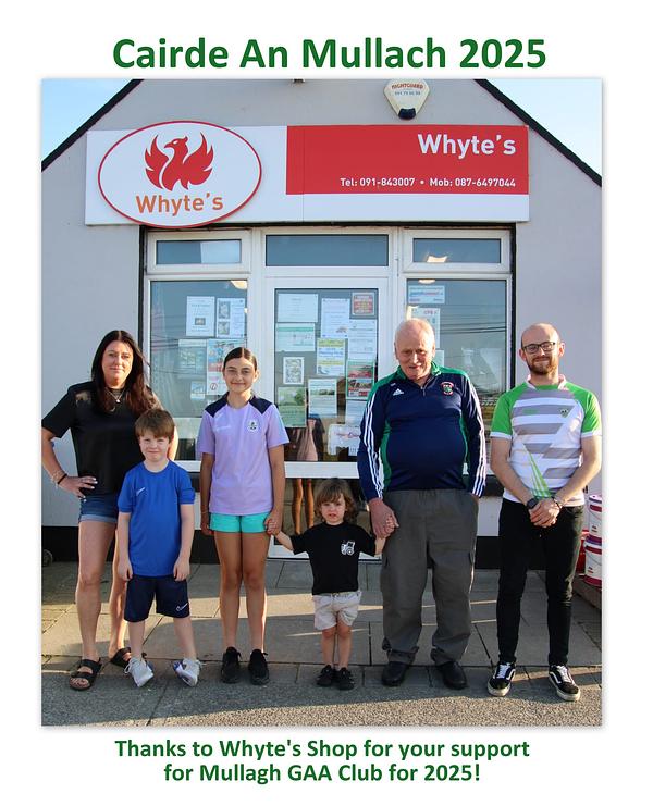 [30/9, 15:25] Margaret Callinan: Hi all as most of you are probably aware, Mullagh GAA Club doesn't have a main sponsor, this decision was taken by the club's committee as there are so many people who help out the club by donating 250euro or more. These people become CAIRDE AN MULLACH.